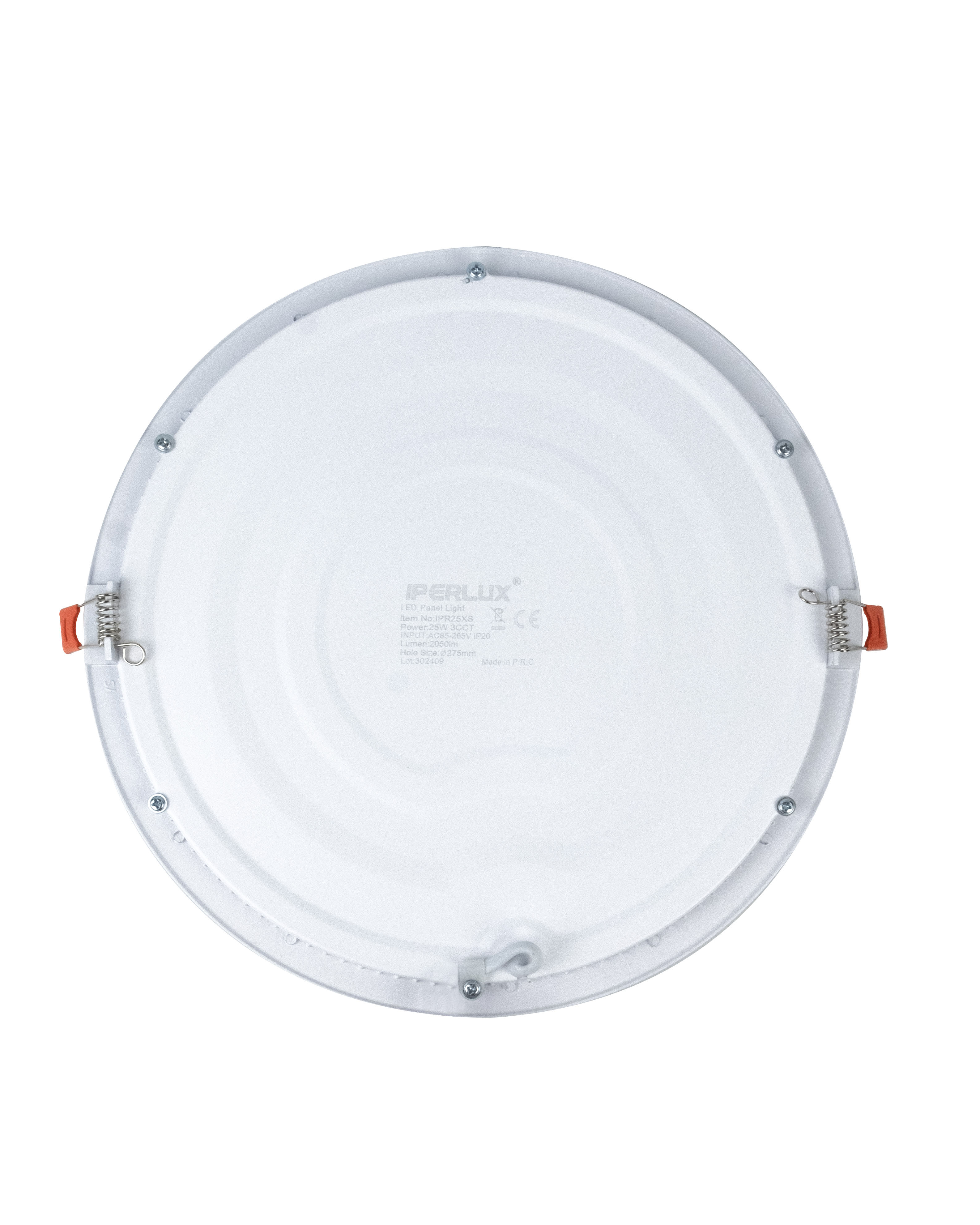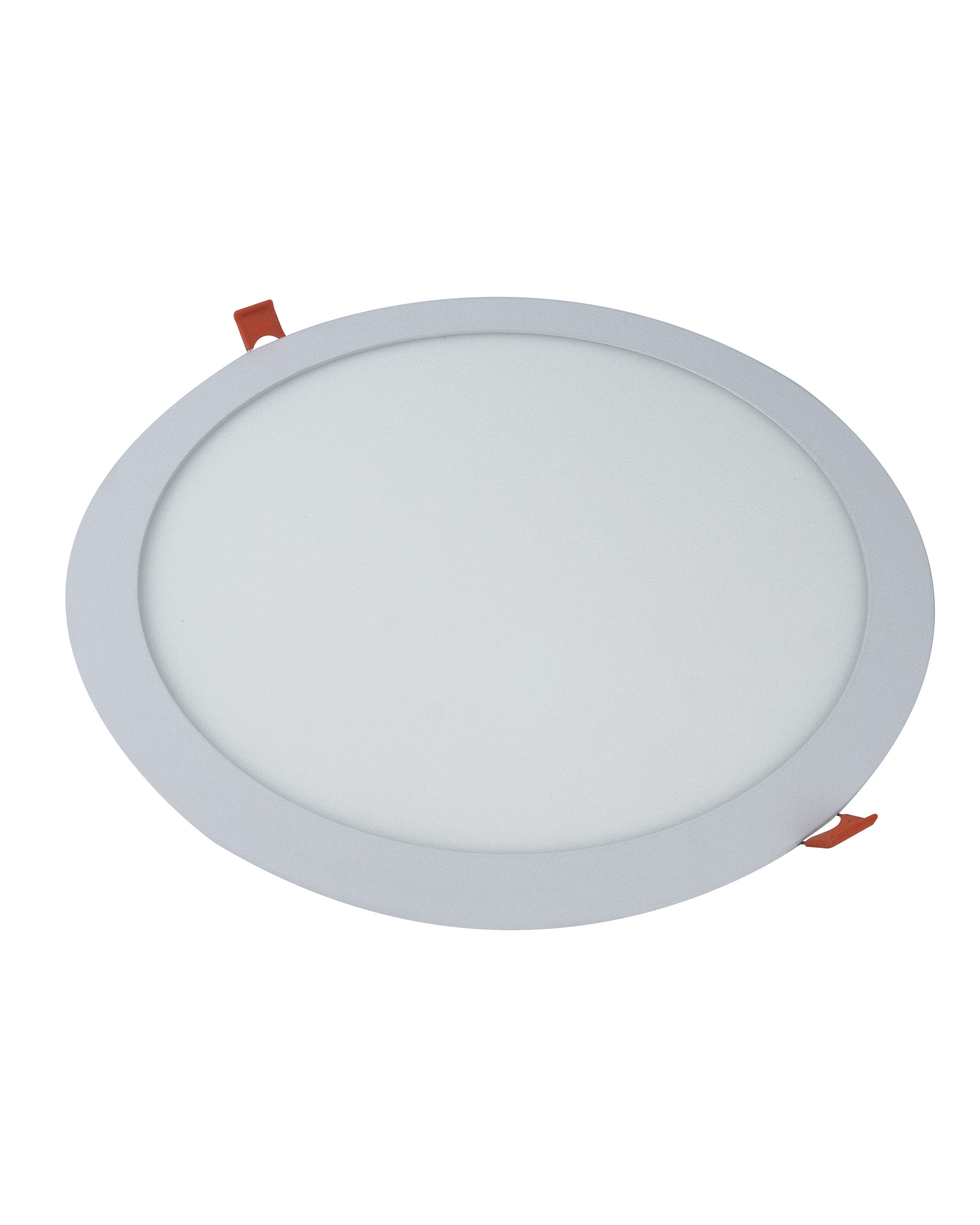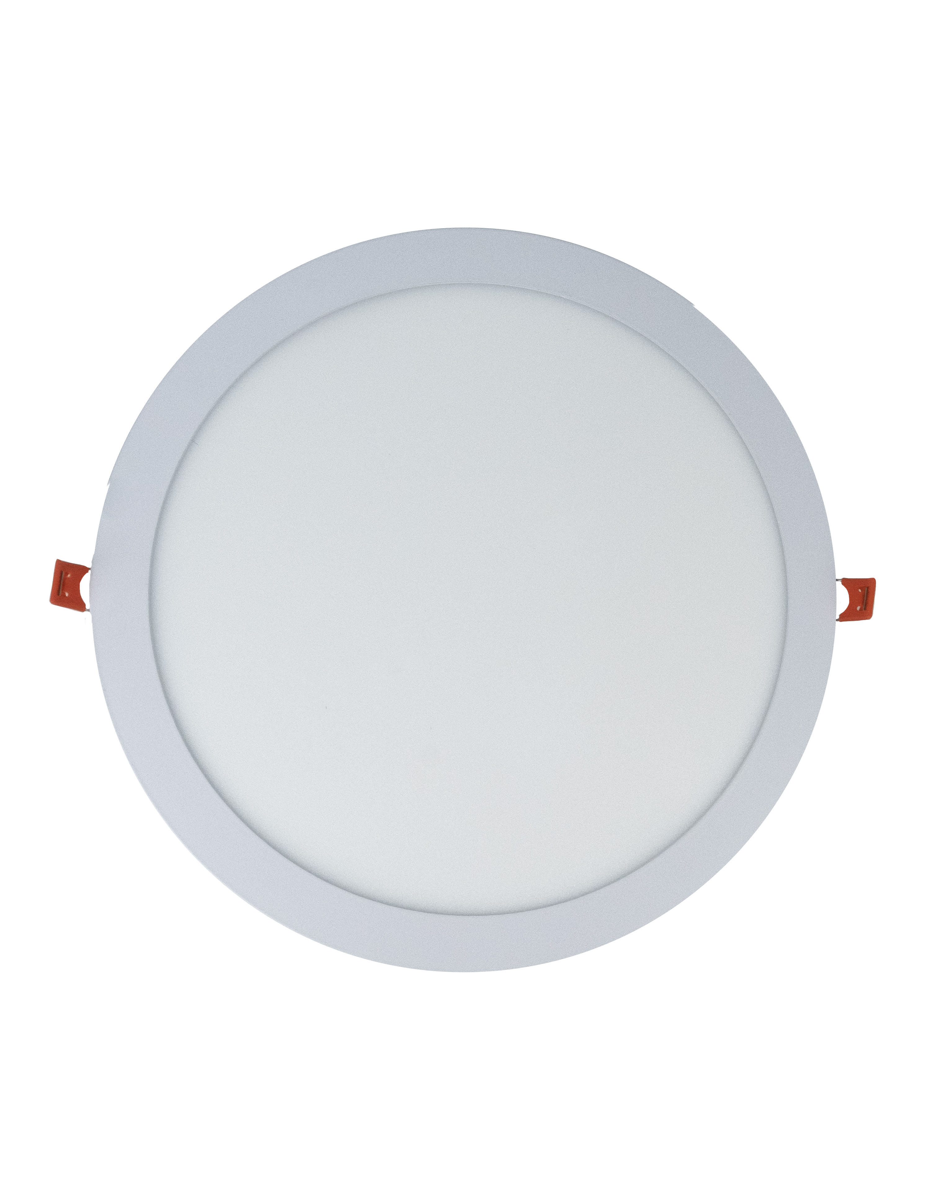 Mini pannello slim a incasso 3CCT rotondo IP20 296Øx16mm con fascio luminoso 120°, potenza 25, temperatura 3CCT, lumen 2050LM, corpo in alluminio, diffusore in policarbonato e foro Ø275mm.