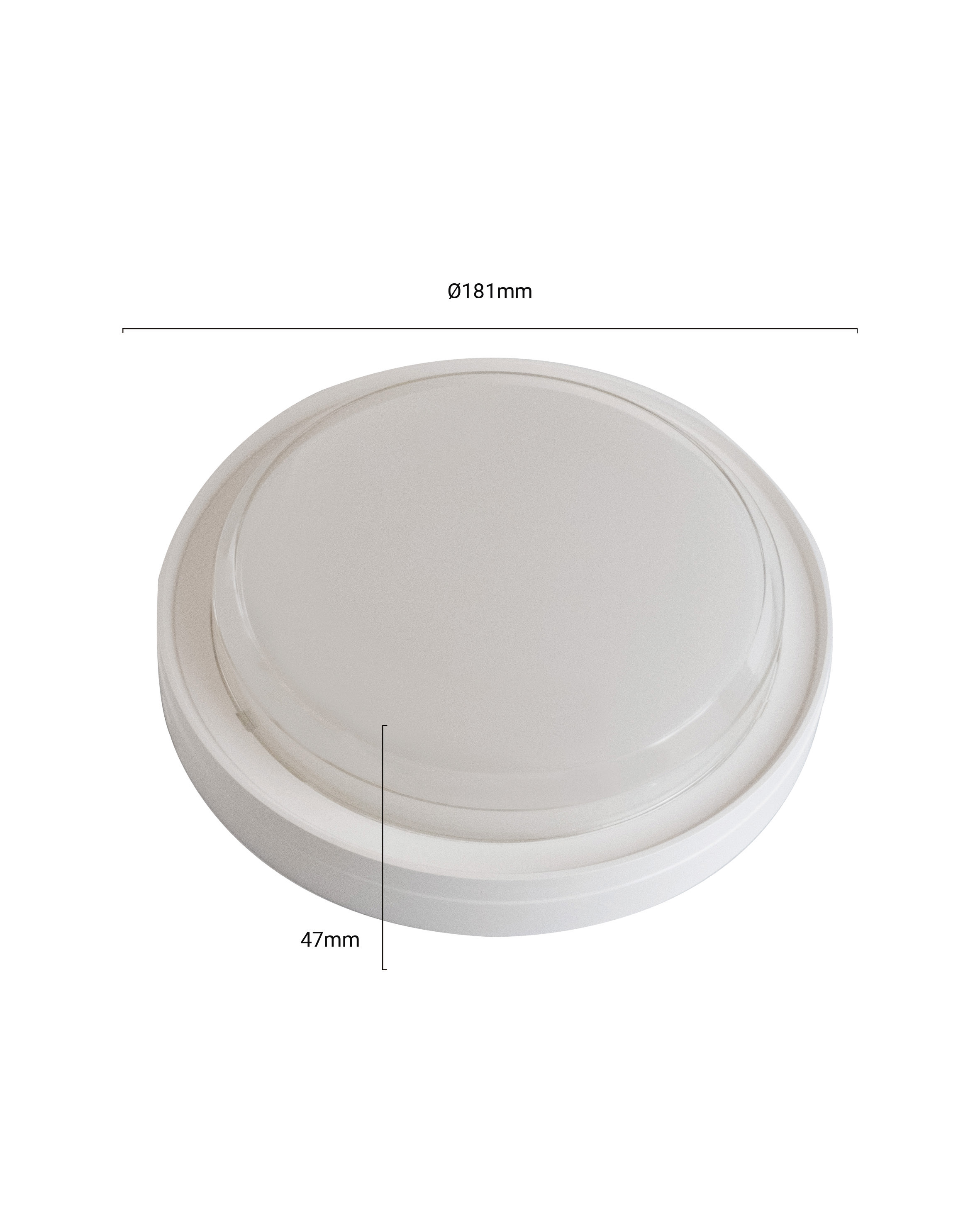 Plafoniera rotonda IP65 181Øx47 mm con fascio luminoso 120°, potenza 12W, temperatura 3CCT, lumen 1200LM, voltaggio 180-250V, corpo e cover in policarbonato.