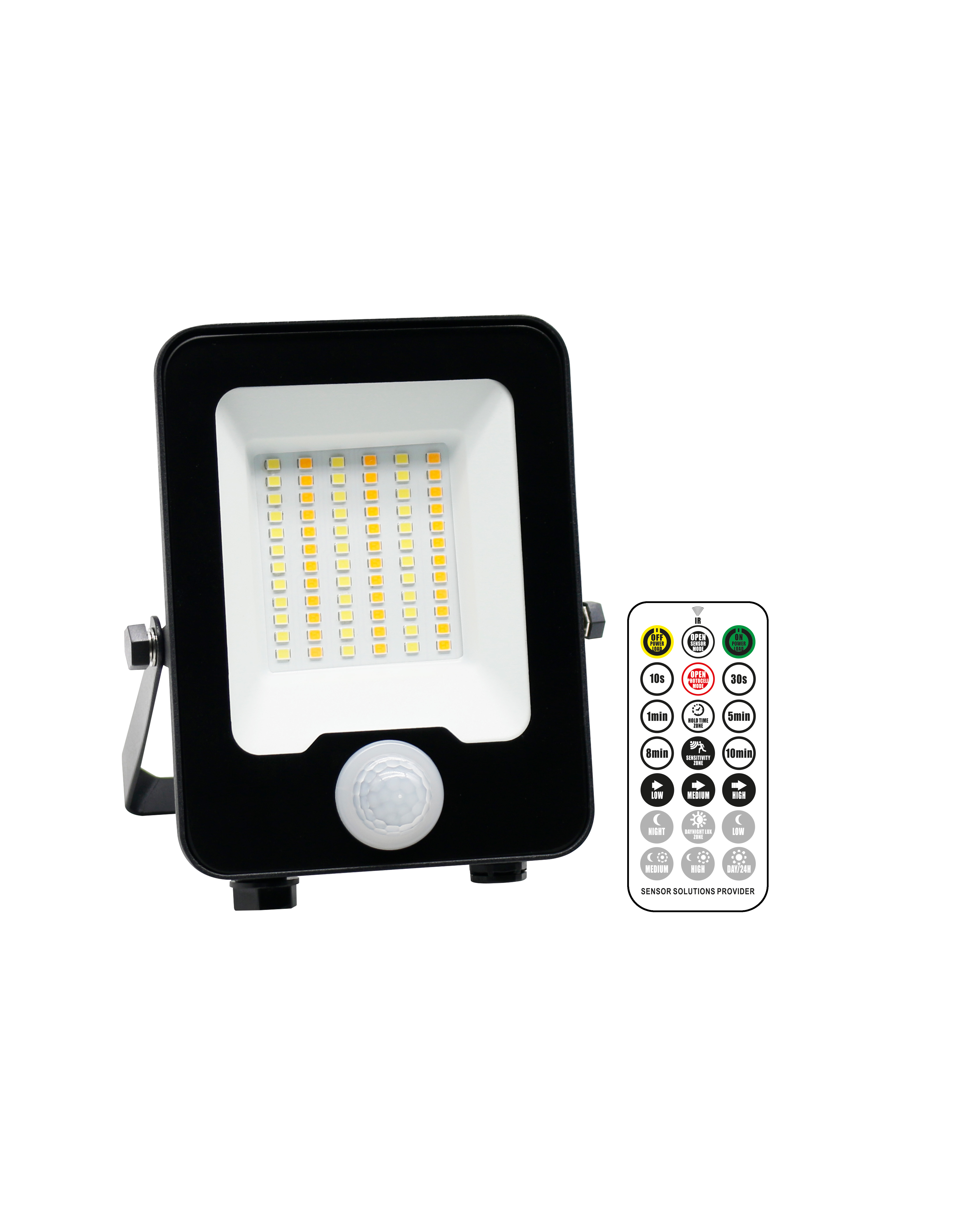 Proiettore con sensore nero IP65 118x165x42mm con fascio luminoso 100°, potenza 30W, temperatura 3CCT, lumen 3000LM, voltaggio 175-265V, corpo in alluminio e cover in vetro; telecomando incluso.