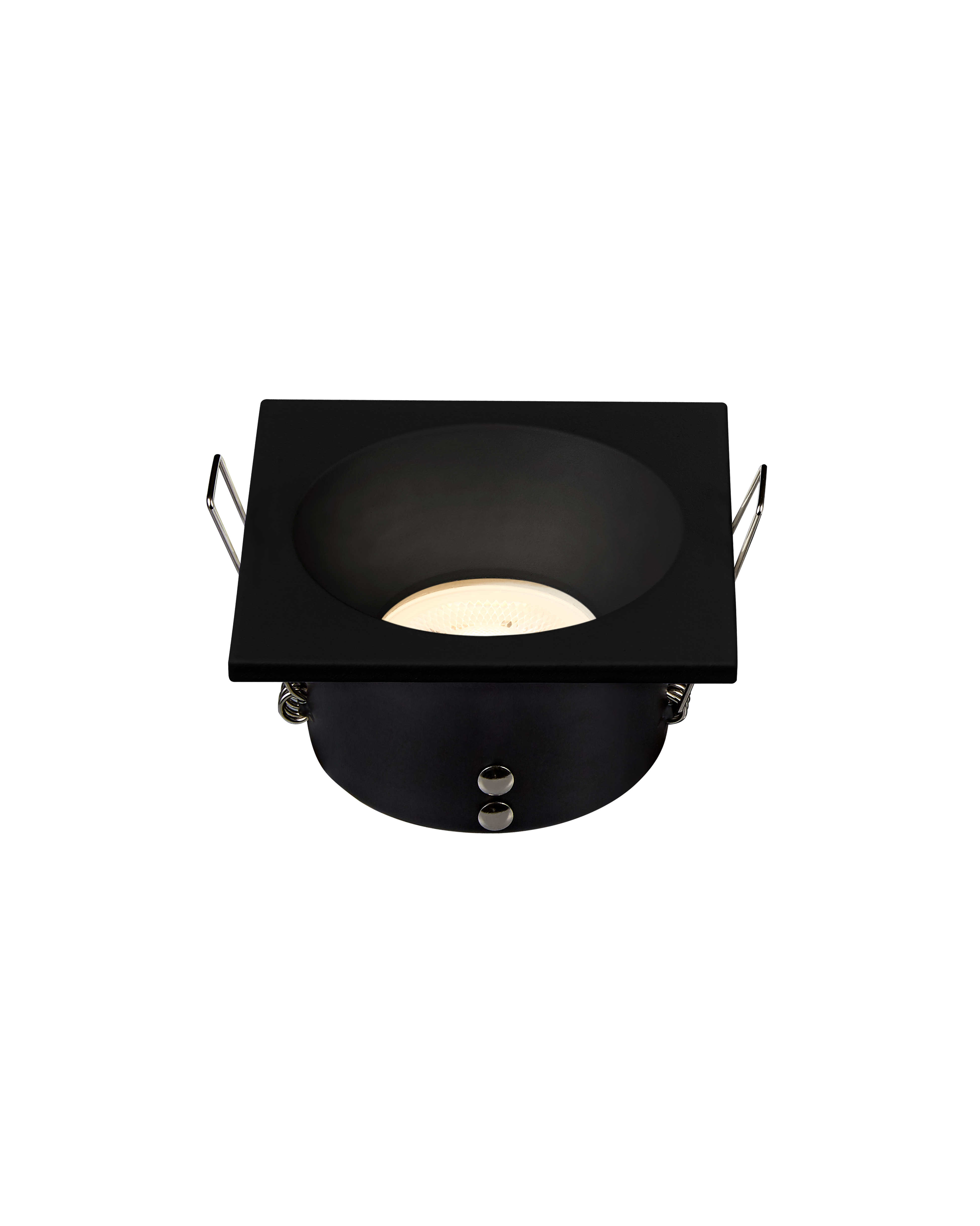 Porta faretto fisso a incasso IP65 in alluminio nero quadrato 85Øx45 mm con adattatore GU10 incluso e foro 71mm con diffusore in vetro.