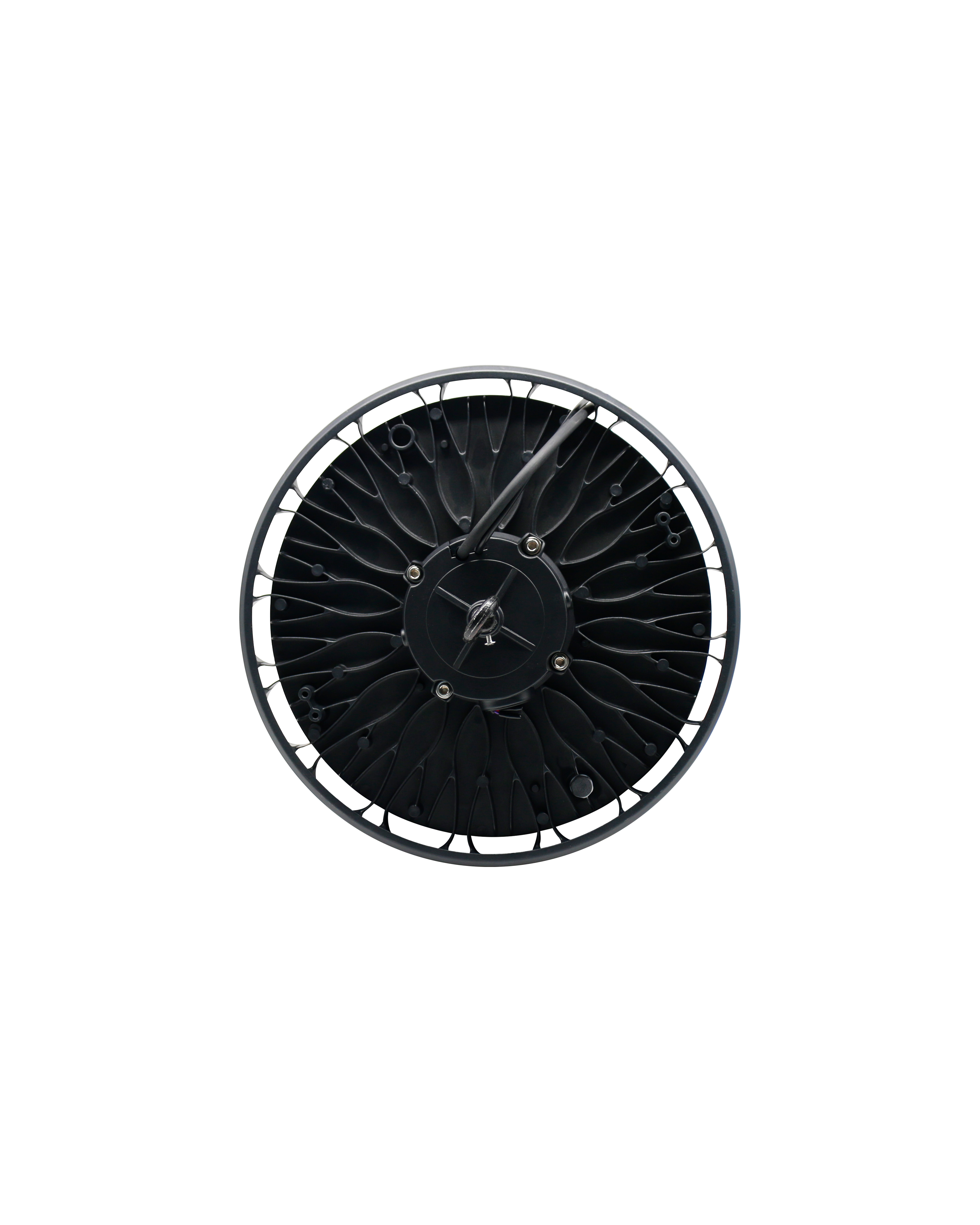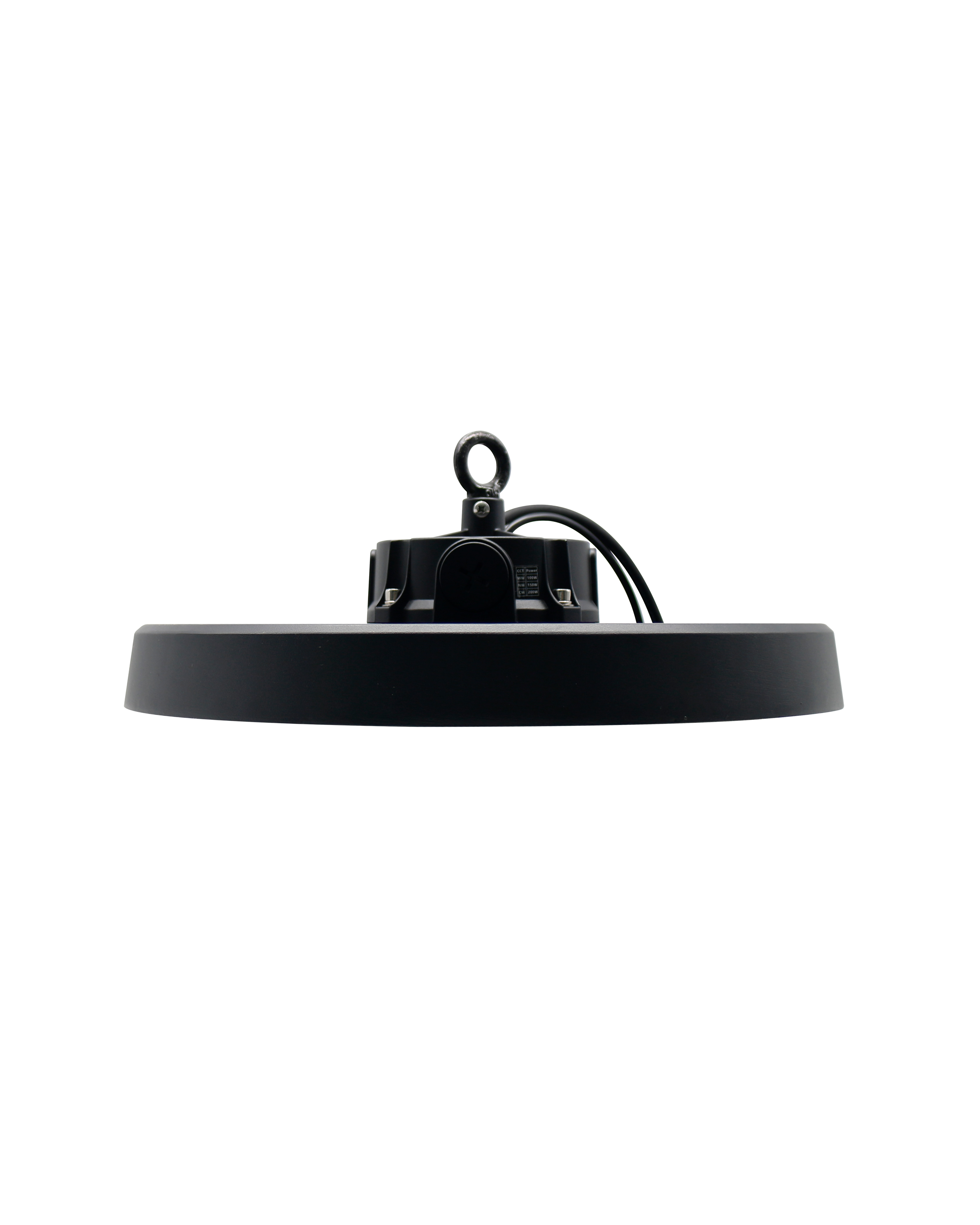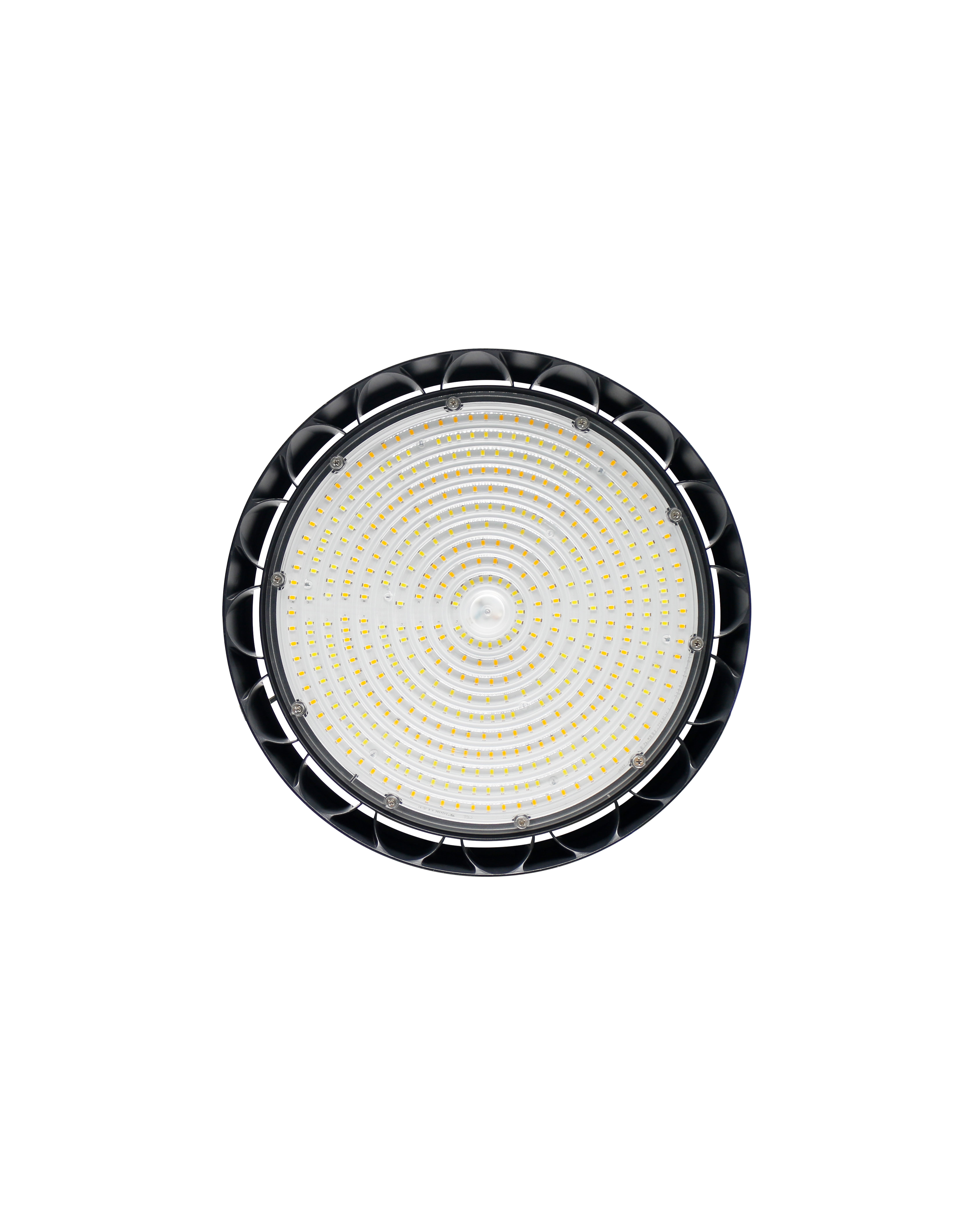 Lampada Ufo IP65 350Øx140mm con fascio luminoso 90°, potenza 100-150-200W, temperatura 3CCT, lumen 27400Lm, voltaggio 100-277V, dimmerabile 0-10V, Driver Sosen, corpo in alluminio e lente in policarbonato.