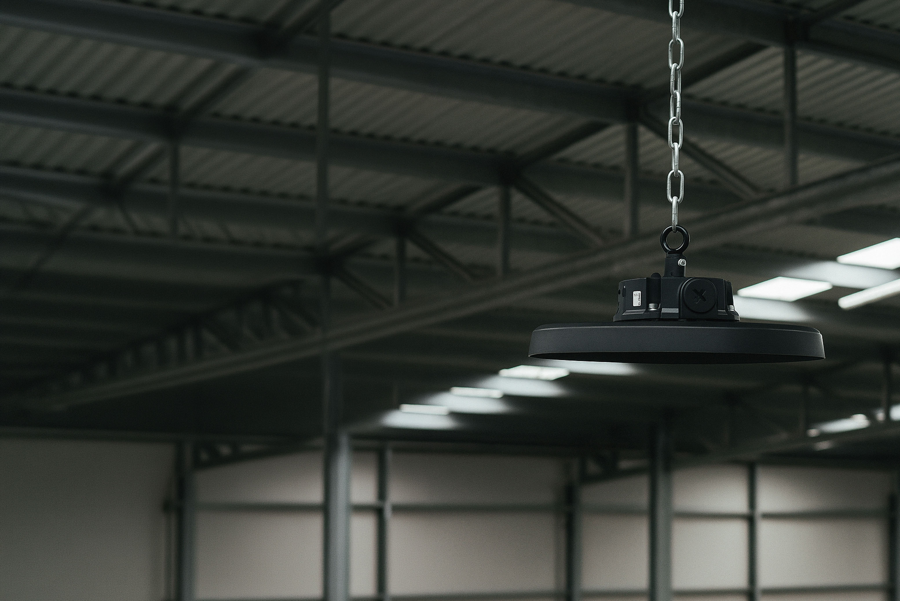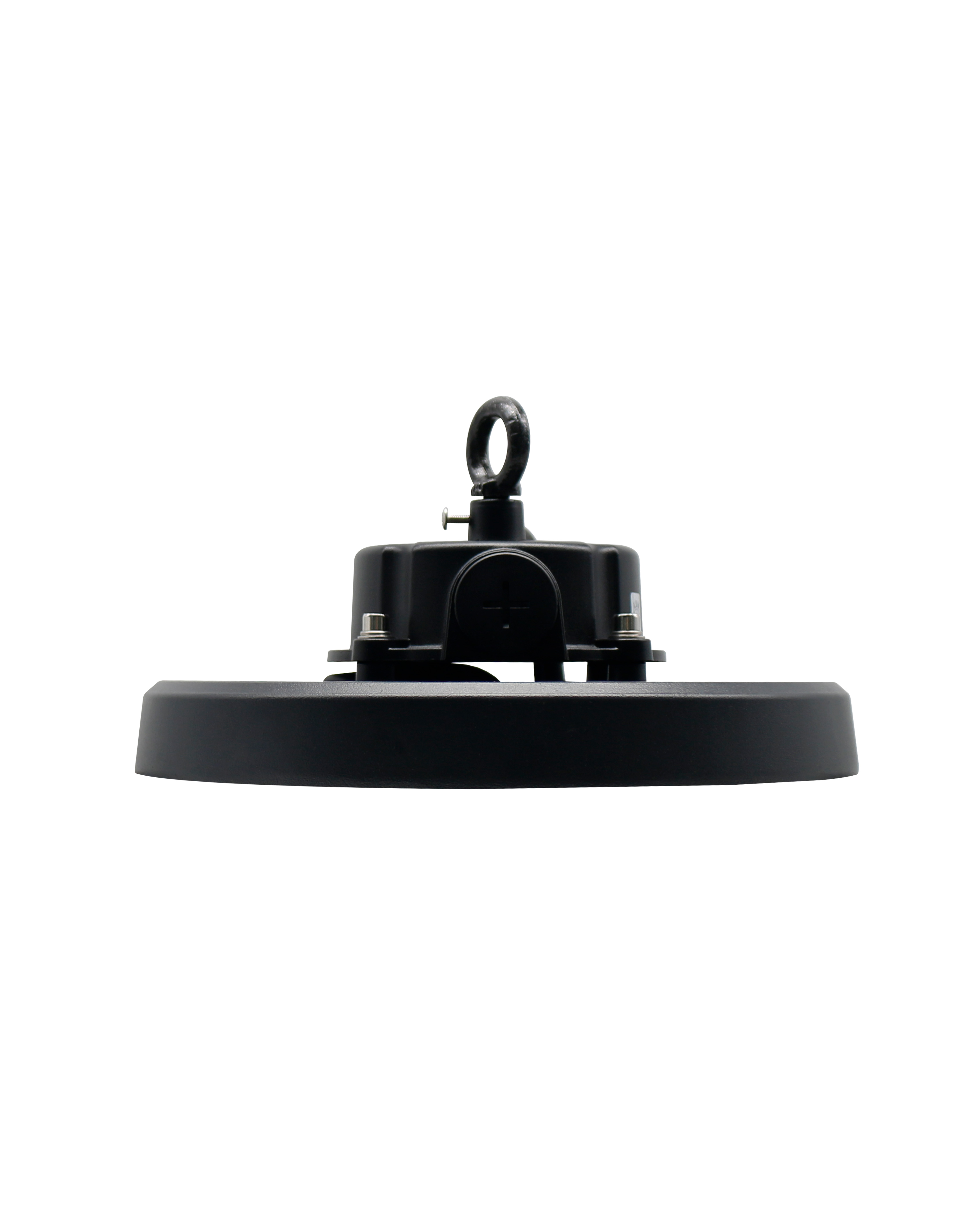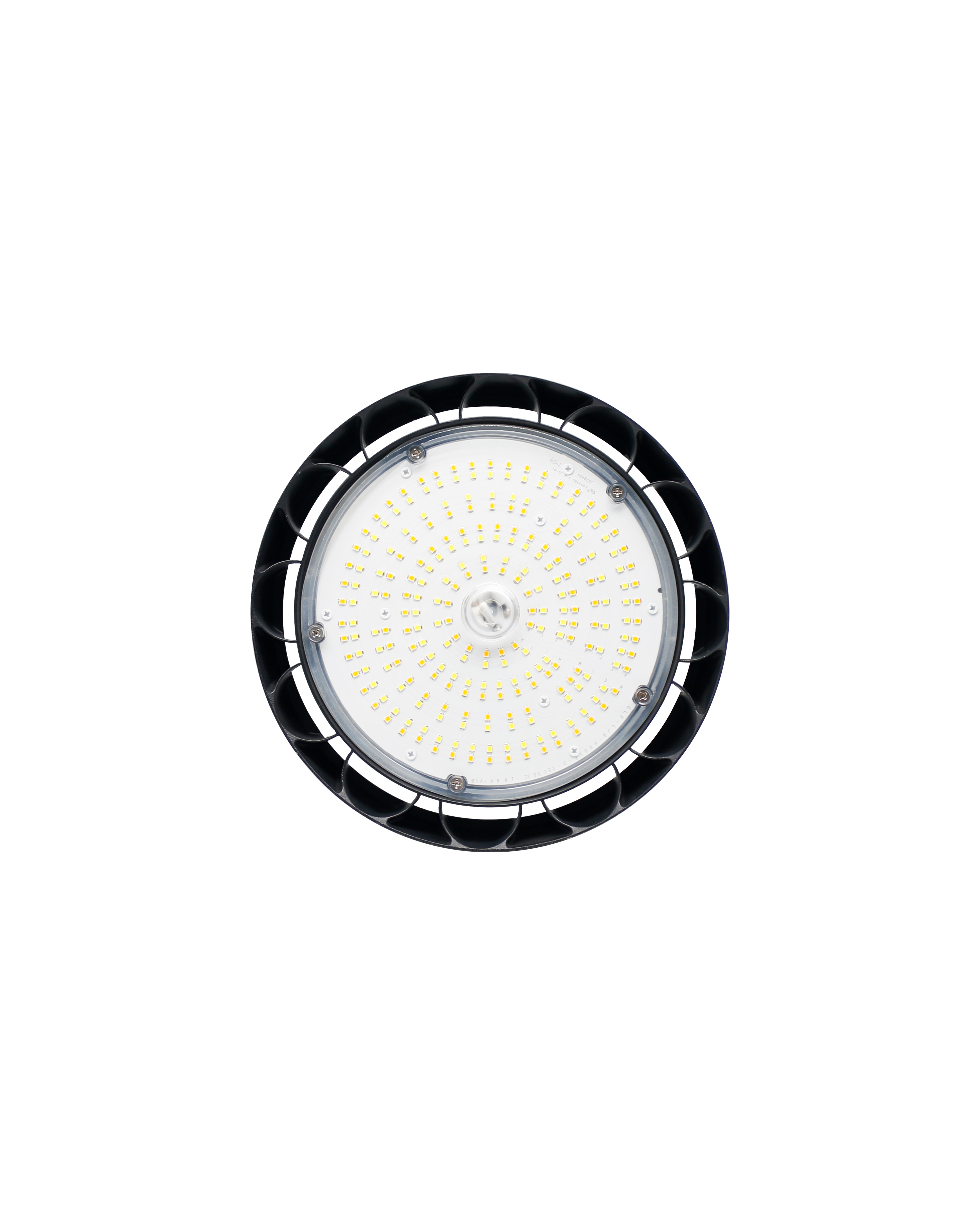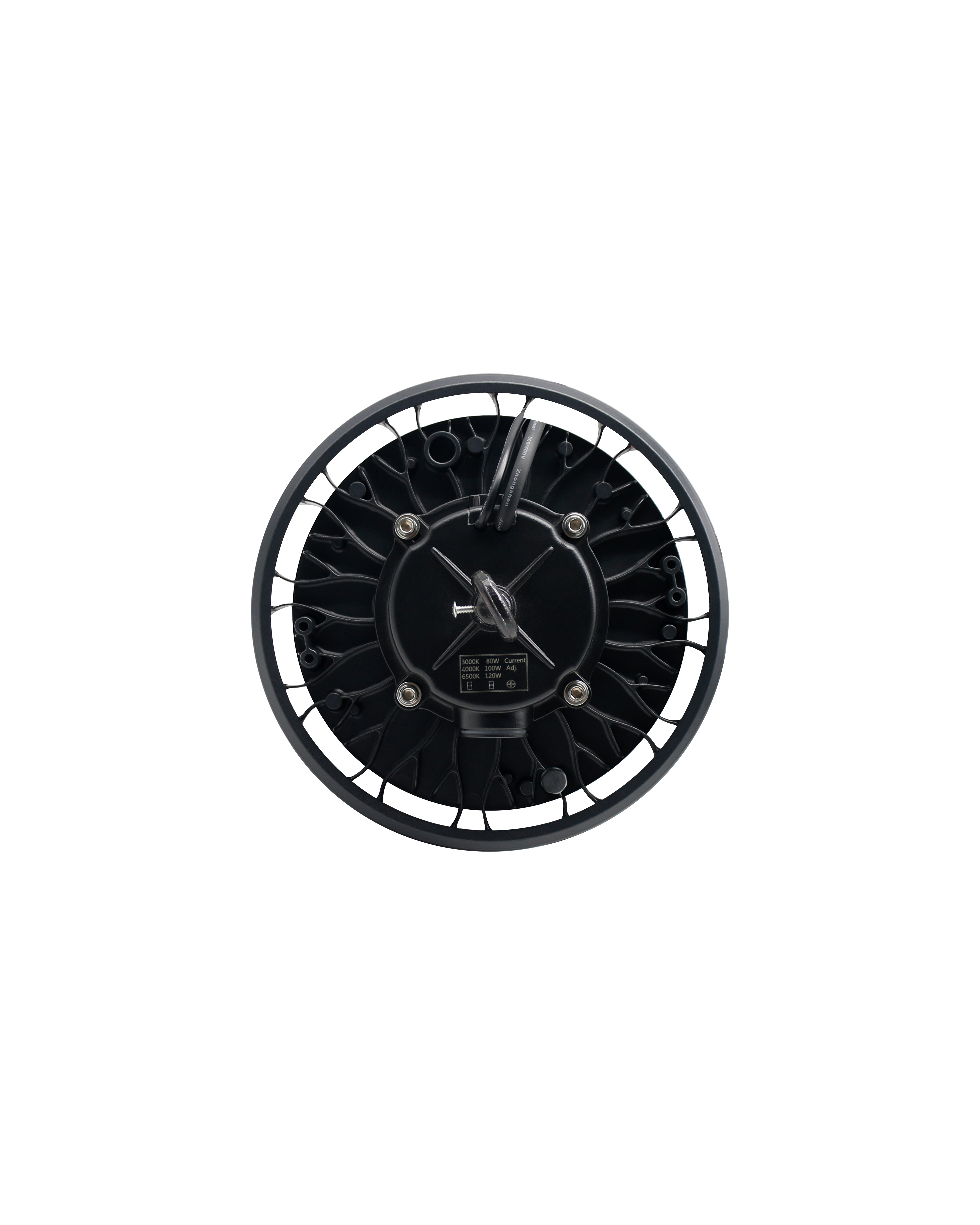 Lampada Ufo IP65 240Øx140mm con fascio luminoso 120°, potenza 80-100-120W, temperatura 3CCT, lumen 15700Lm, voltaggio 120-277V, dimmerabile 0-10V, Driver ZH, corpo in alluminio e lente in policarbonato.